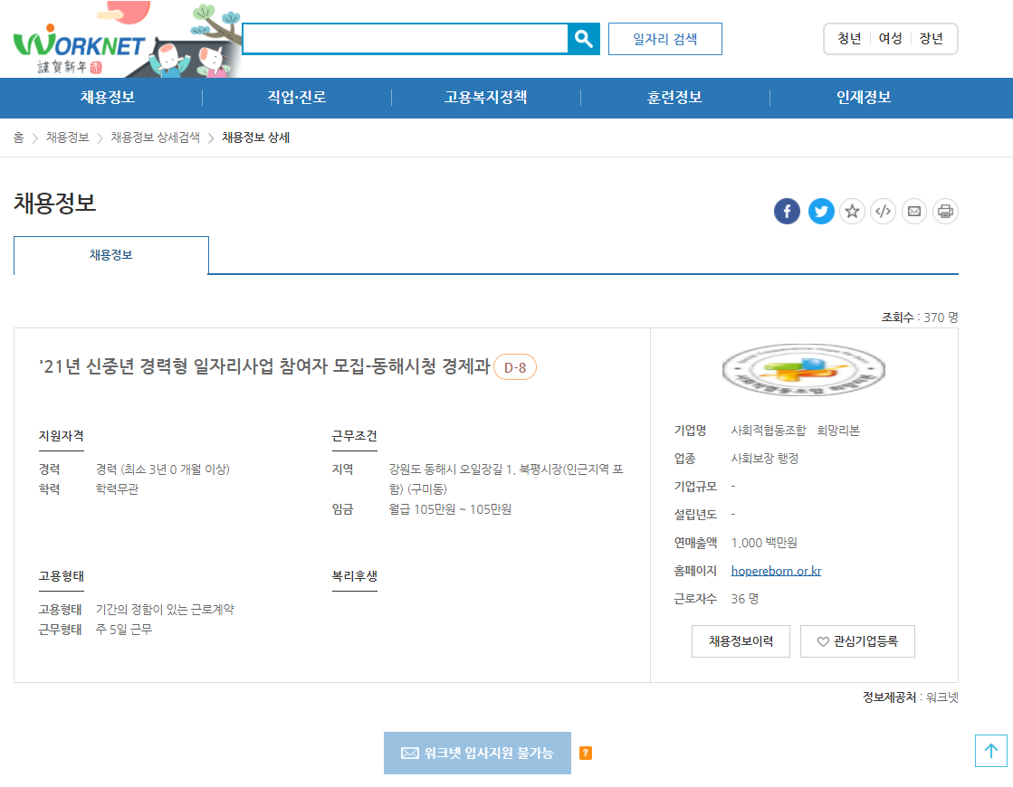 - 관심 있는 공고에 들어가면, 채용정보 및 모집요강, 근무조건, 전형방법, 우대사항, 기타사항, 복리후생, 채용담당자 연락처, 위치정보, 인증기관 정보 등을 확인할 수 있음
