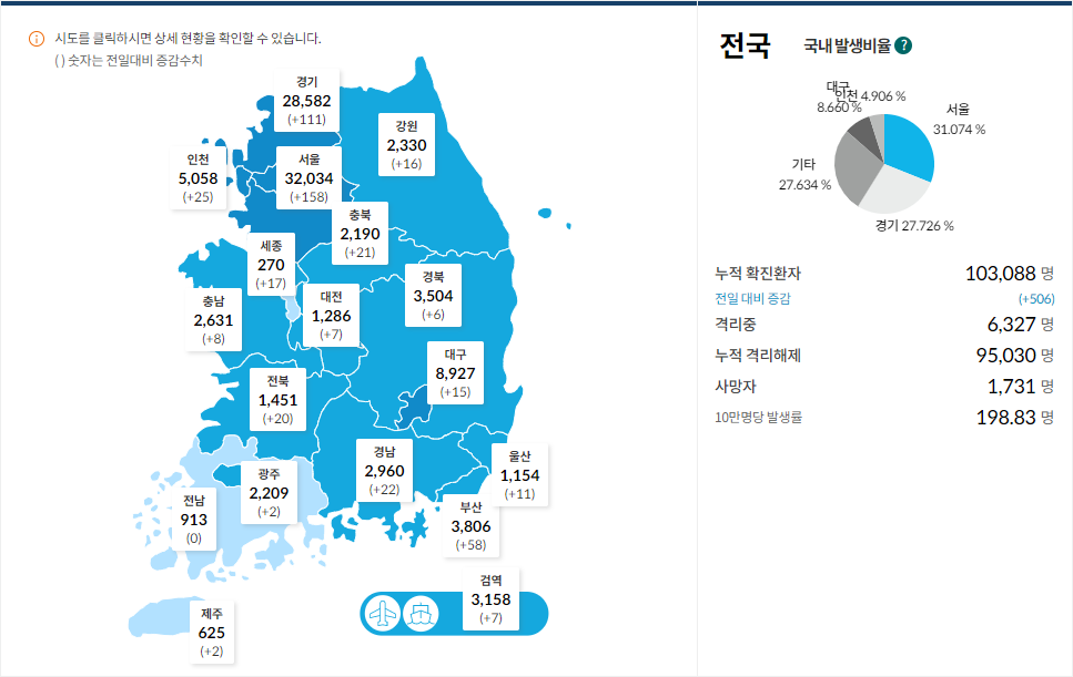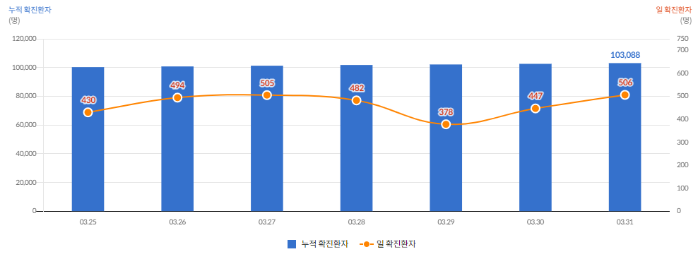 일일 확진자는 506명(3.31 00시 기준), 누적 확진자는 103,088명이라고 합니다.