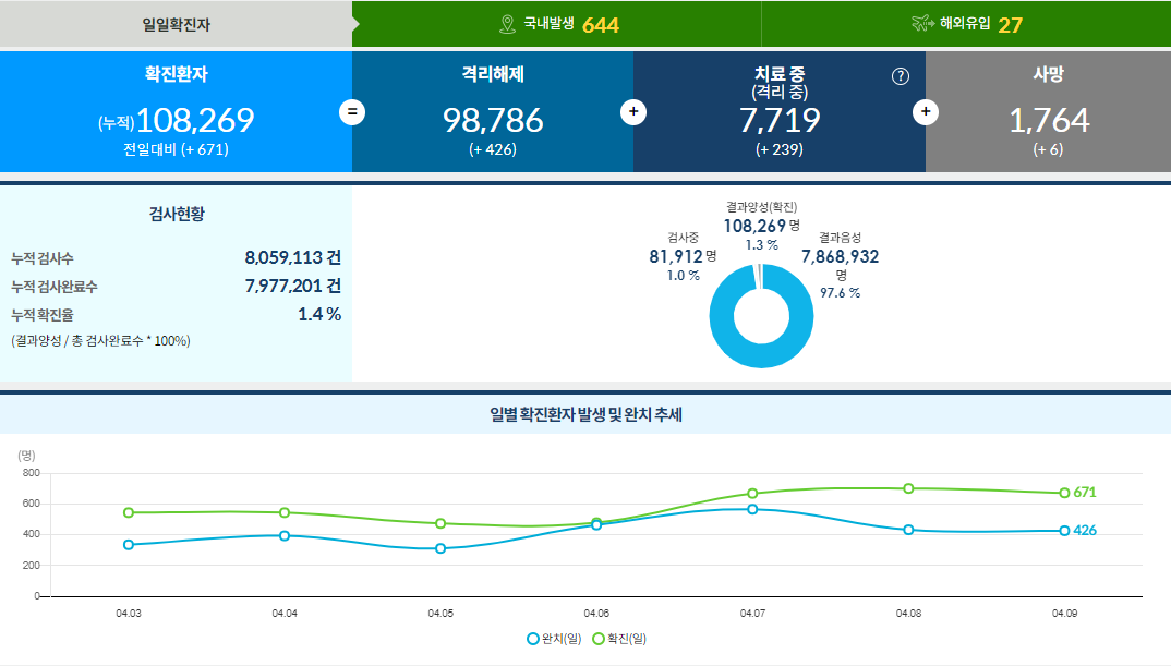 일일 확진자는 671명(4.9 0시 기준), 누적 확진자는 108,269명,