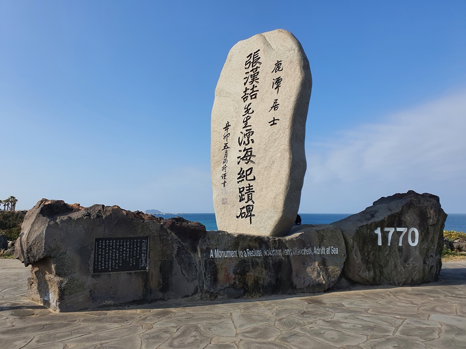 비석엔 영어로 "A Monument to a Recluse Nokdam Jang Han Cheol, Adrift at Sea" 쓰여있는데,