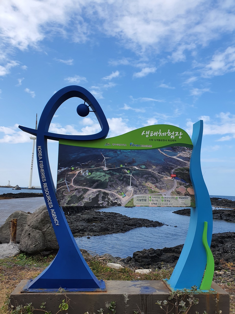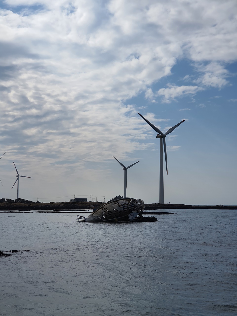 멀리서 물고기 조형물과 풍력발전소 사진을 찍는 것으로 아쉬움을 달래며..