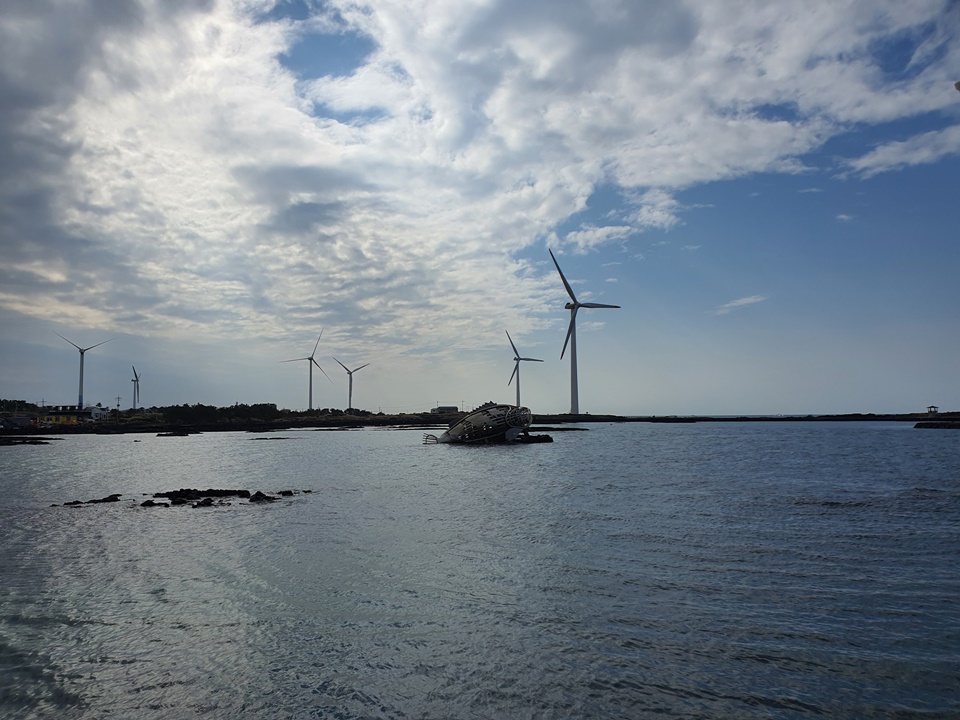 바다 위에 떠 있는 풍력발전기들을 볼 수 있는 핫플레이스입니다.