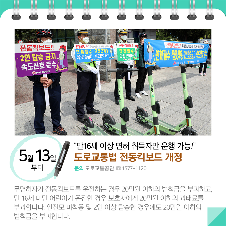 ◆ “만 16세 이상 면허 취득자만 운행 가능!”… 도로교통법 전동킥보드 개정 (5월 13일부터)