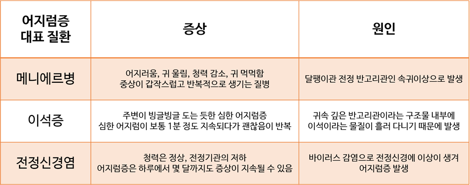 - 이러한 어지럼증을 일으키는 대표적인 질환으로는 귀질환(말초성)과 뇌질환(중추성)이 있으며, 그 외 심장 질환, 안과 질환 등이 있어도 다양한 양상의 어지럼증이 유발될 수 있습니다.