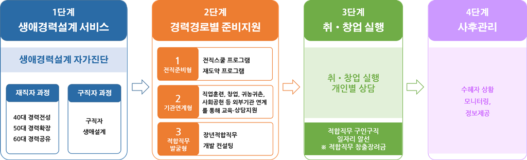 전직·재취업 및 창업 관련하여 유형별‧단계별 맞춤형 고용지원 서비스를 제공하는 것입니다.