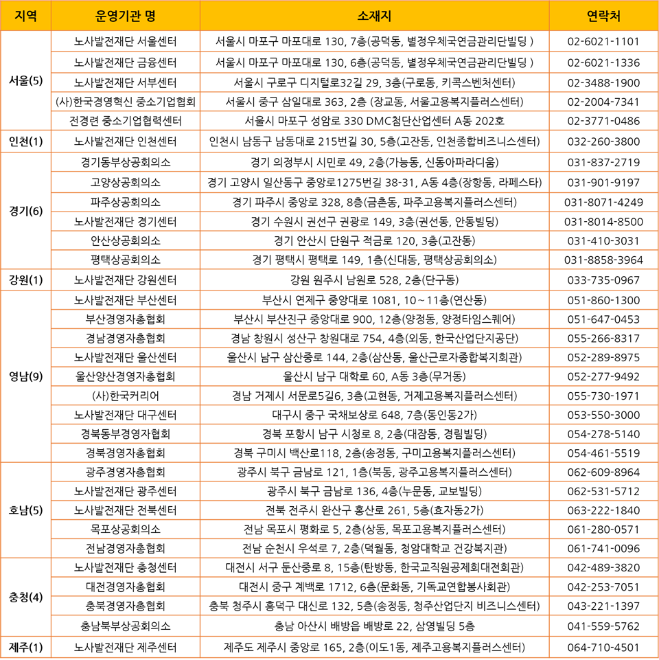 - 구직활동에 필요한 사무기기(PC, 프린터, 복사기, 팩스 등) 무료 제공 - 운영센터: 노사발전재단 서울, 서울 서부, 인천, 경기 부산, 대구, 전북, 광주, 충청, 강원, 제주 |