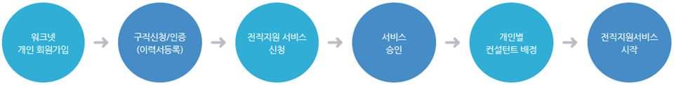 취업활동계획 수립 → 구직서류(이력서 및 자기소개서) 코칭 → 구직전략 수립 → 면접전략 → 구직알선 → 취업 → 사후관리 |