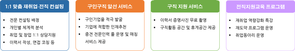 (재직자) 상담, 심리안정‧변화관리 등 전직 교육, 역량진단, 취‧창업 정보 제공 등 전직 또는 경력개발을 위한 컨설팅 제공 (구직자) 1:1 상담, 취업알선, 재취업지원 교육, 취‧창업 정보 제공, 동아리 운영 등 재취업지원 서비스 제공 신중년 적합 직무 고용장려금 제도와 연계하여 양질의 일자리 발굴 및 취업알선 지원 위 서비스와 연계하여 기업 대상 찾아가는 설명회, 구인 알선 상담, 지원금 제도 안내 등을 통한 중장년 인력 채용 및 경력관리 지원 |