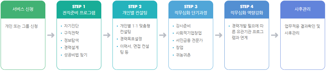 취업활동계획 수립 → 구직서류(이력서 및 자기소개서) 코칭 → 구직전략 수립 → 면접전략 → 구직알선 → 취업 → 사후관리 |