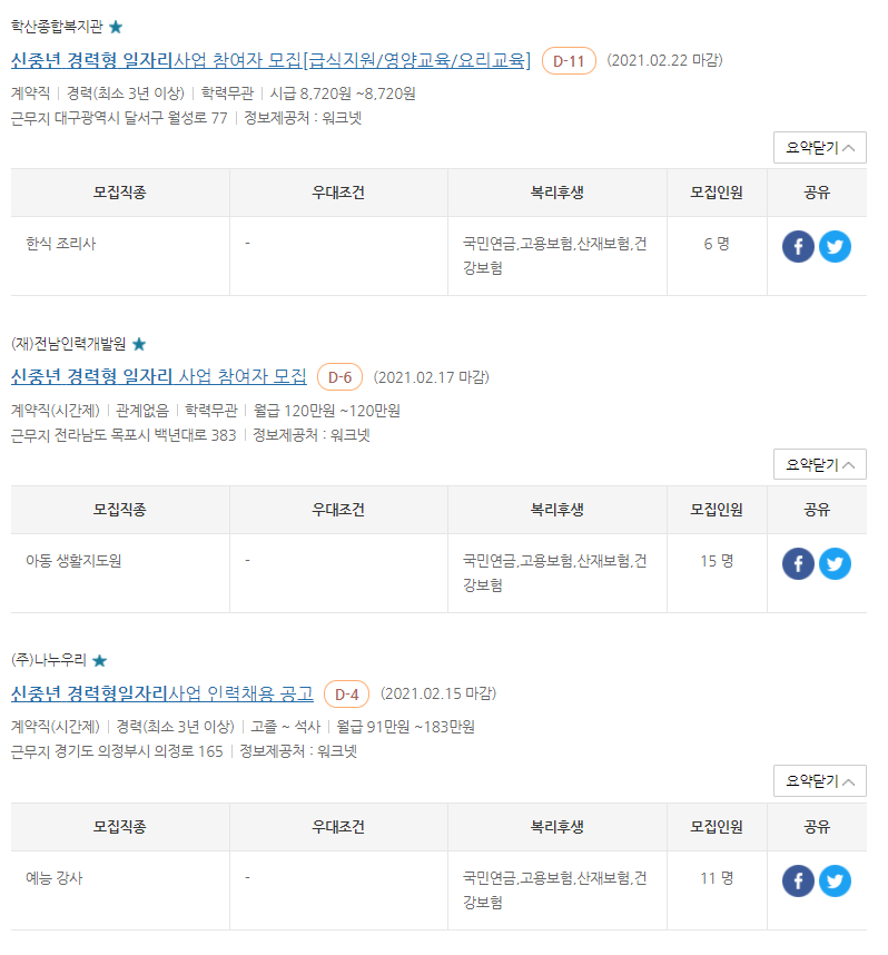 - 관심 있는 공고에 들어가면, 채용정보 및 모집요강, 근무조건, 전형방법, 우대사항, 기타사항, 복리후생, 채용담당자 연락처, 위치정보, 인증기관 정보 등을 확인할 수 있음