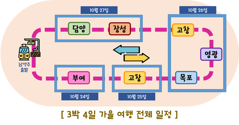 10월 24일(토) : 남양주 출발 -> 부여 관광[억새밭(나래 공원), 점심(연잎 담), 궁남지, 코스모스 단지] -> 고창으로 이동 후 숙박