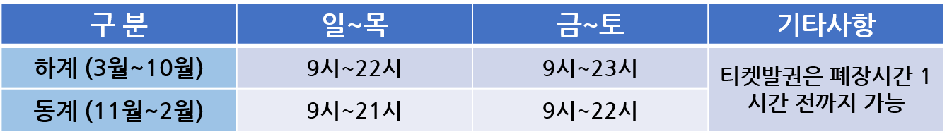 - 티켓 발권은 아침 8시 30분부터 폐장시간 1시간 전까지 가능