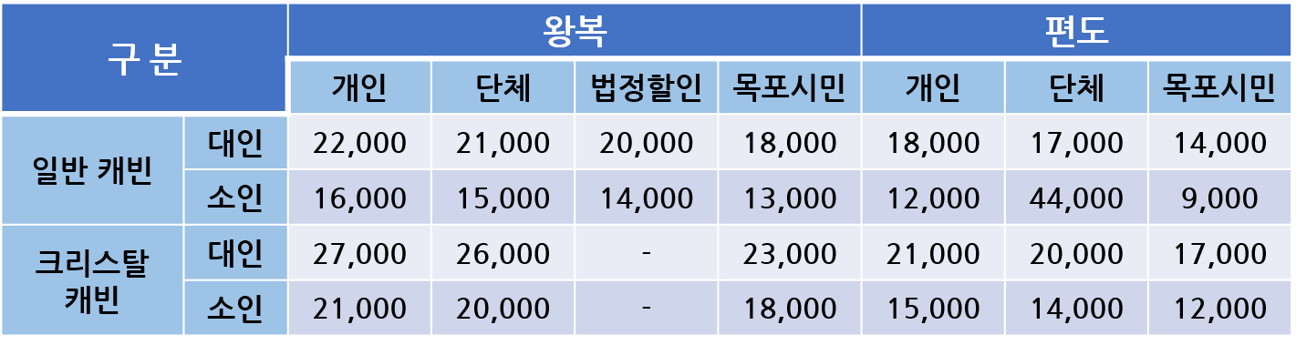 - 목포시민: 대인 4000원 할인, 소인 3000원 할인(왕복, 편도 동일, 확인증 제출 시 적용)