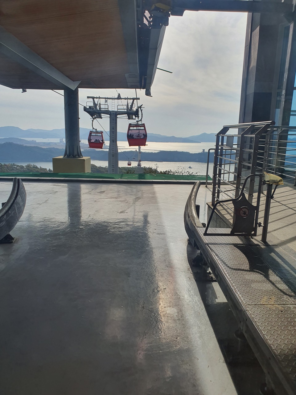 저희가 내리니 직원들이 천천히 이동 중인 빈 케이블카들을 소독하느라고 바쁜 모습을 보였습니다.