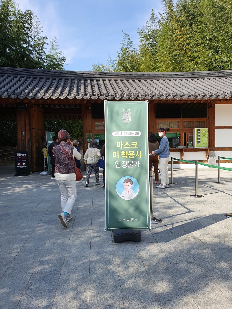 죽녹원 매표소에 왔습니다. '마스크 미착용 시 입장 불가' 배너가 크게 보이네요.
