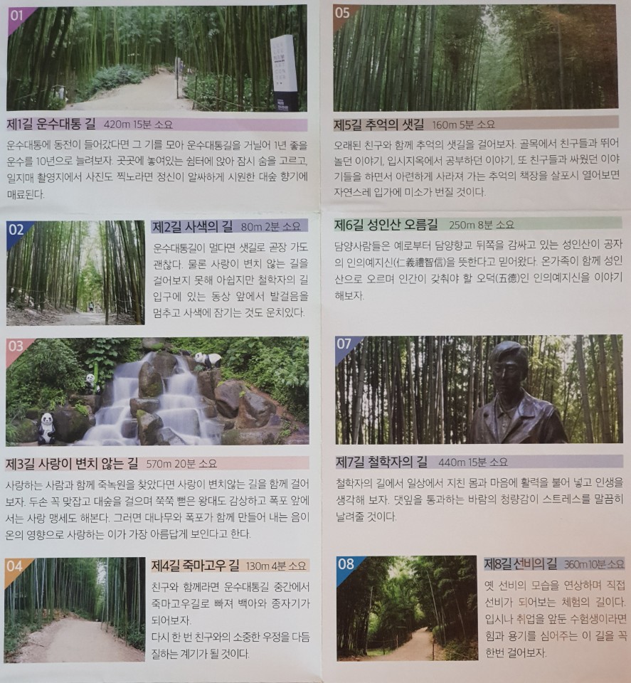 죽녹원에는 다양한 주제를 가진 8개의 길이 있습니다.