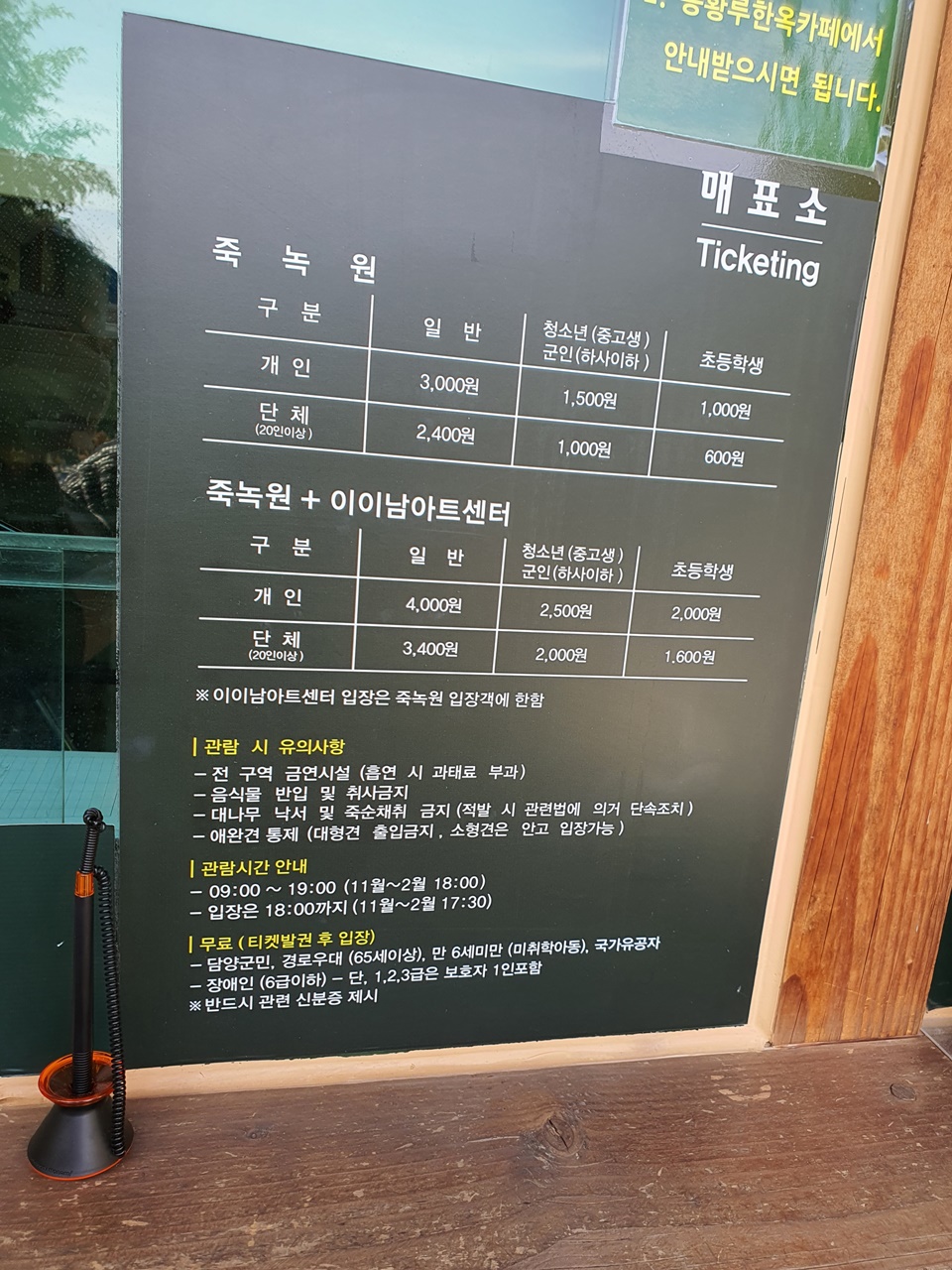 담양군민과 65세 이상, 만 6세 미만 미취학 아동, 국가유공자는 무료입장,