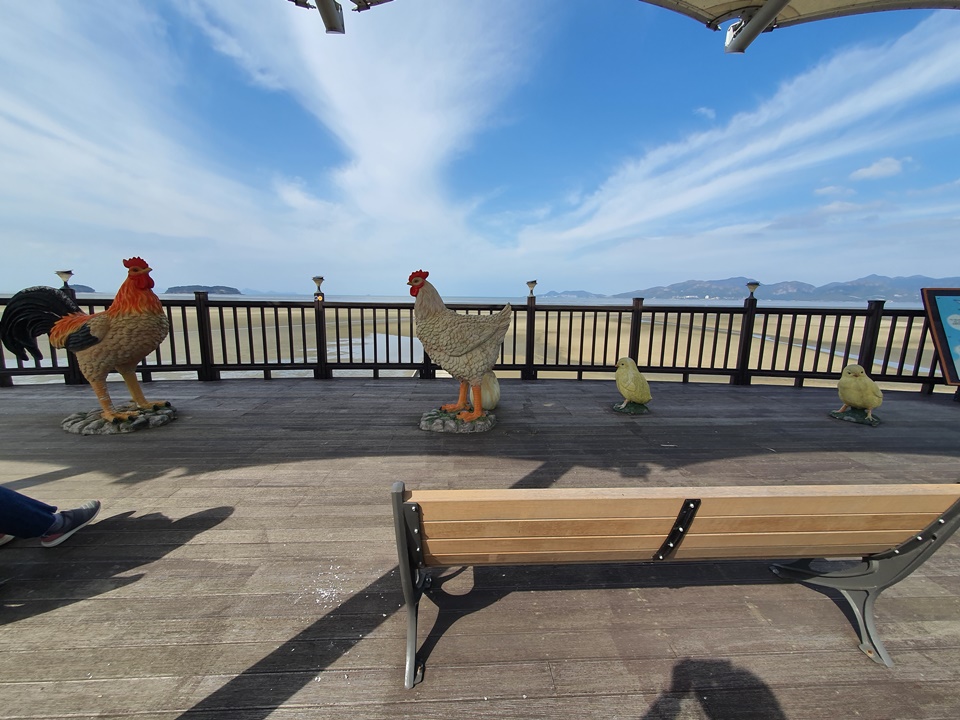 갯벌과 하늘 위 구름, 그리고 닭과 병아리들이 은근히 멋진 풍경을 만들어냅니다.