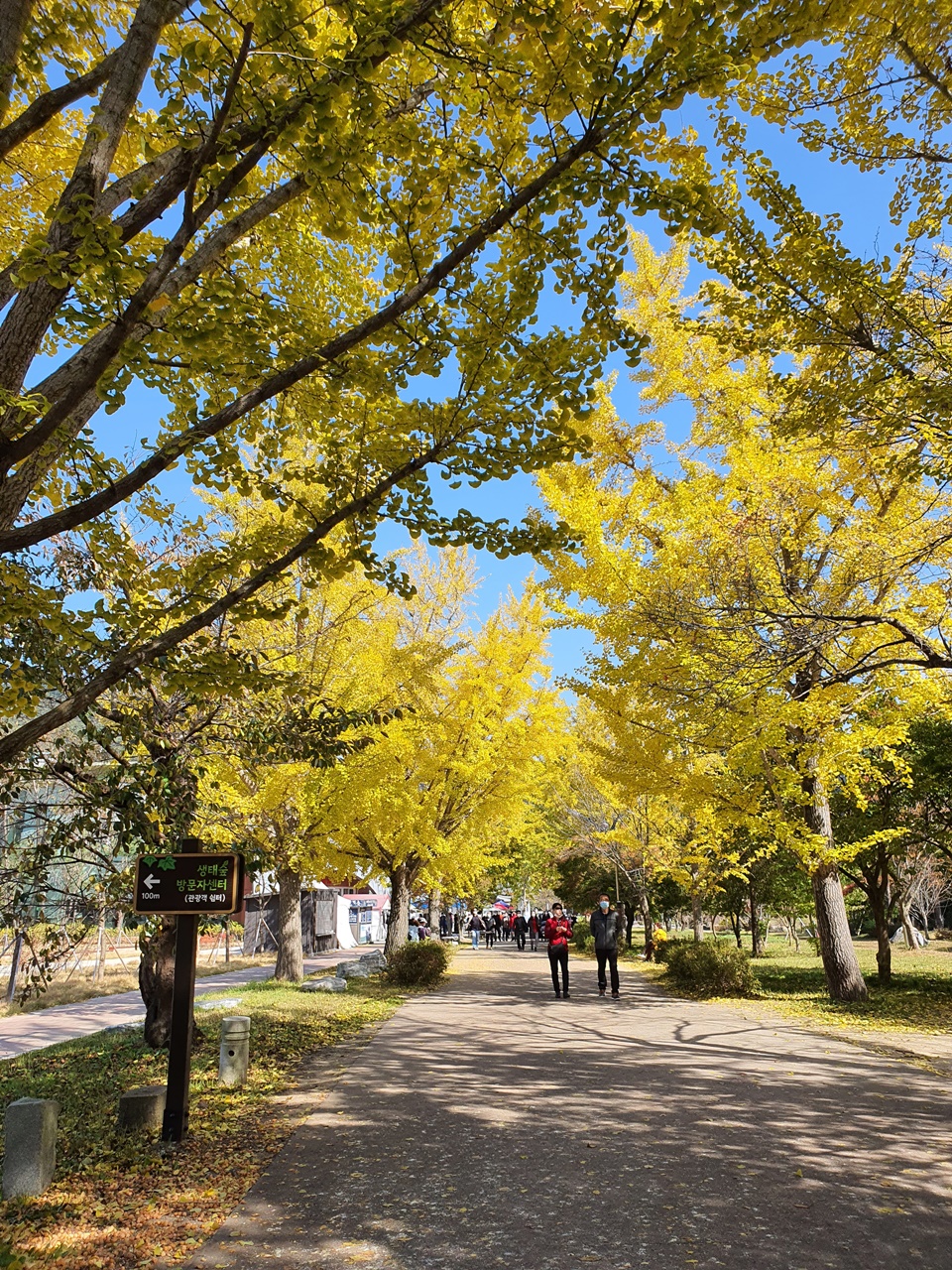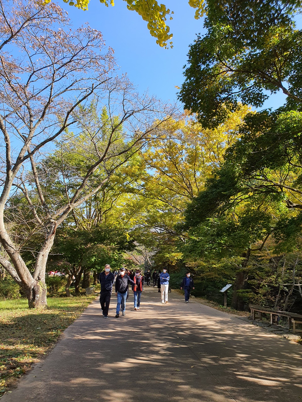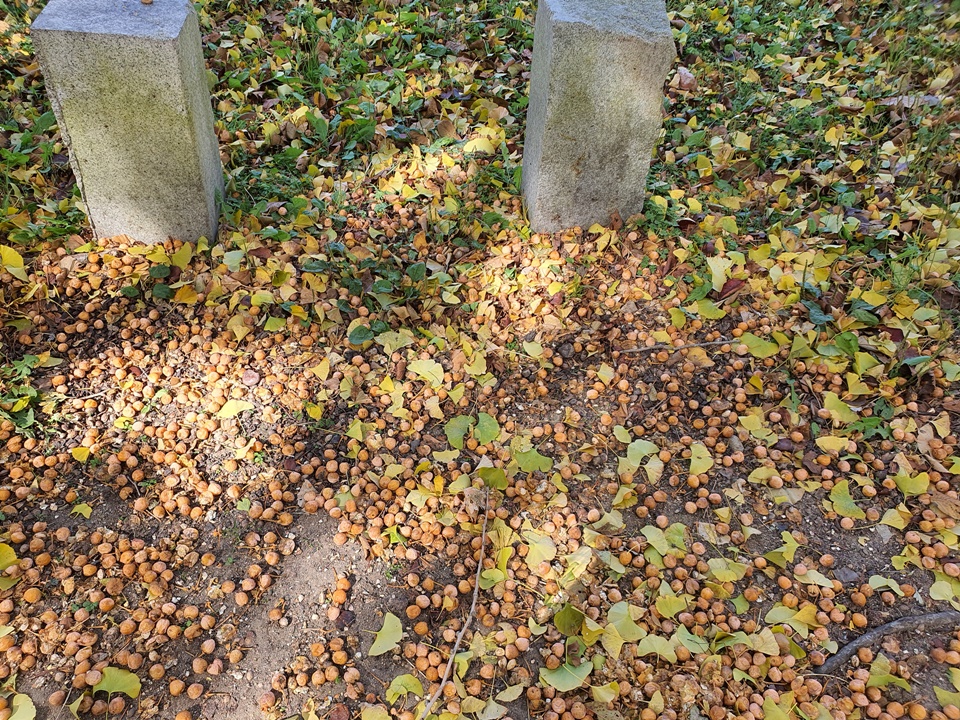 산책길에서 볼 수 있는 은행나무와 단풍나무들 그리고 동백나무들