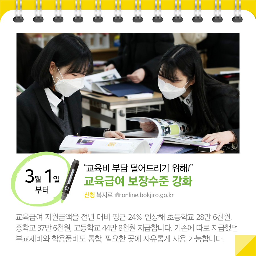 교육급여 지원금액을 전년 대비 평균 24% 인상해 초등학교 28만 6천원, 중학교 37만 6천원, 고등학교 44만 8천원 지급합니다. 기존에 따로 지급했던 부교재비와 학용품비도 통합, 필요한 곳에 자유롭게 사용 가능합니다.