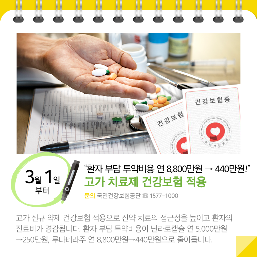 - 치료 효과가 좋지만 고가여서 의료비가 부담됐던 신약 치료제의 접근성 높이기 위해 3월 1일부터 건강보험 적용