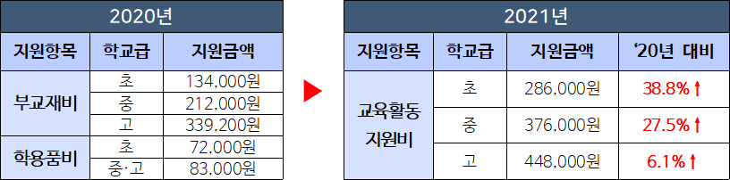 - 기존에 따로 지급했던 부교재비와 학용품비를 '교육활동 지원비'로 통합해 필요한 곳에 자유롭게 사용 가능