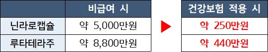 고가 신규 약제 건강보험 적용으로 신약 치료의 접근성을 높이고 환자의 진료비가 경감됩니다. 환자 부담 투약비용이 닌라로캡슐 연 5,000만원 → 250만원, 루타테라주 연 8,800만원 → 440만원으로 줄어듭니다.