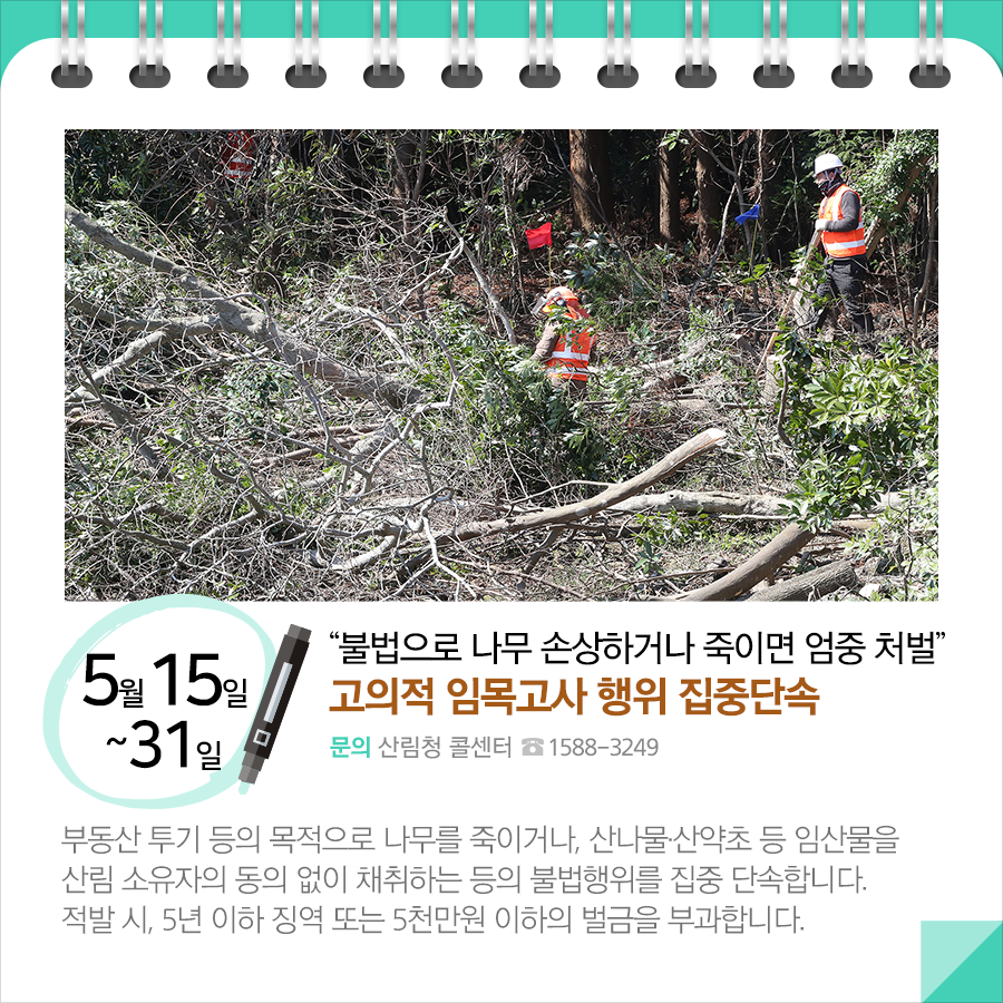 부동산 투기 등의 목적으로 불법으로 나무를 고사 시키는 행위가 급증함에 따라 고의적 임목고사 행위에 대한 집중단속을 실시합니다. 국유림, 사유림 등 산림 관할에 상관없이 강도 높은 단속을 실시하고, 불법행위가 적발된 경우 5년 이하 징역 또는 5천만원 이하 벌금에 처합니다.
