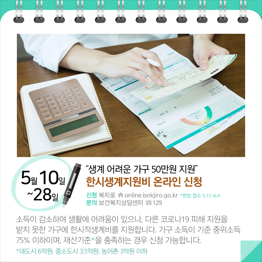 ◆ “생계 어려운 가구 50만원 지원!”… 한시생계지원비 온라인 신청 (5월 10일~28일)