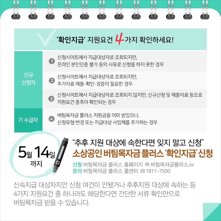 ◆ “추후 지원 대상에 속한다면 잊지 말고 신청!”… 소상공인 버팀목자금 플러스 '확인지급'신청 (5월 14일까지)