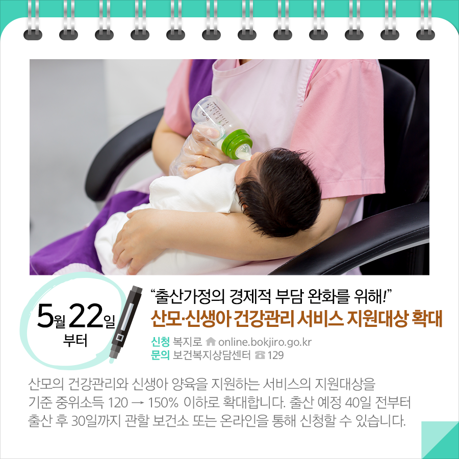 ◆ “출산가정의 경제적 부담 완화를 위해”… 산모·신생아 건강관리 서비스 지원대상 확대 (5월 22일부터)