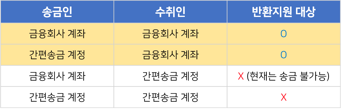 단, 거짓이나 부정한 방법으로 신청하거나 착오송금이 아님을 객관적인 자료로 확인되는 경우, 관련 소송이 진행 중이거나 완료된 경우에는 반환지원 신청이 취소됩니다.