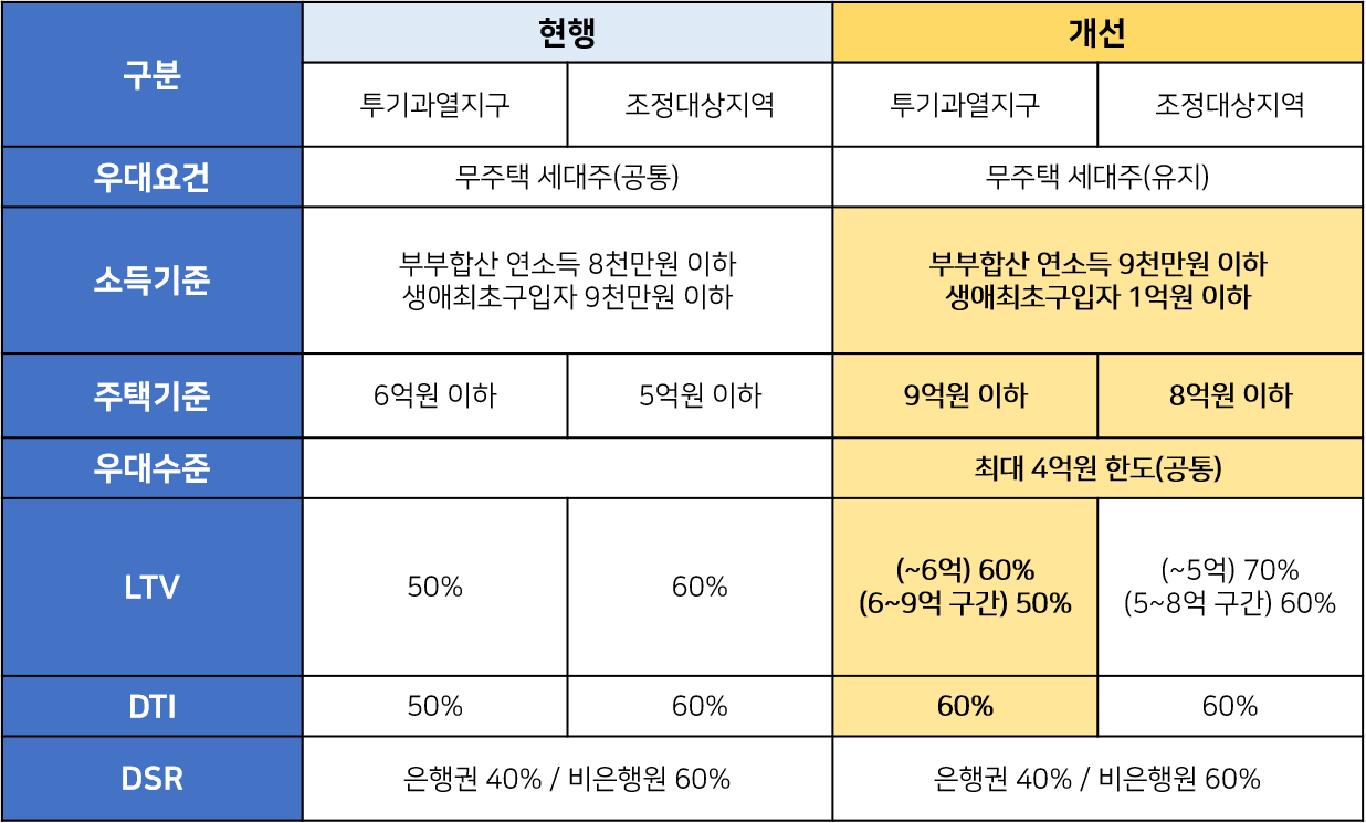 - 부부 합산 소득 기준 : 일반 8천만원 → 9천만원 / 생애최초 구입자 9천만원 → 최대 1억원