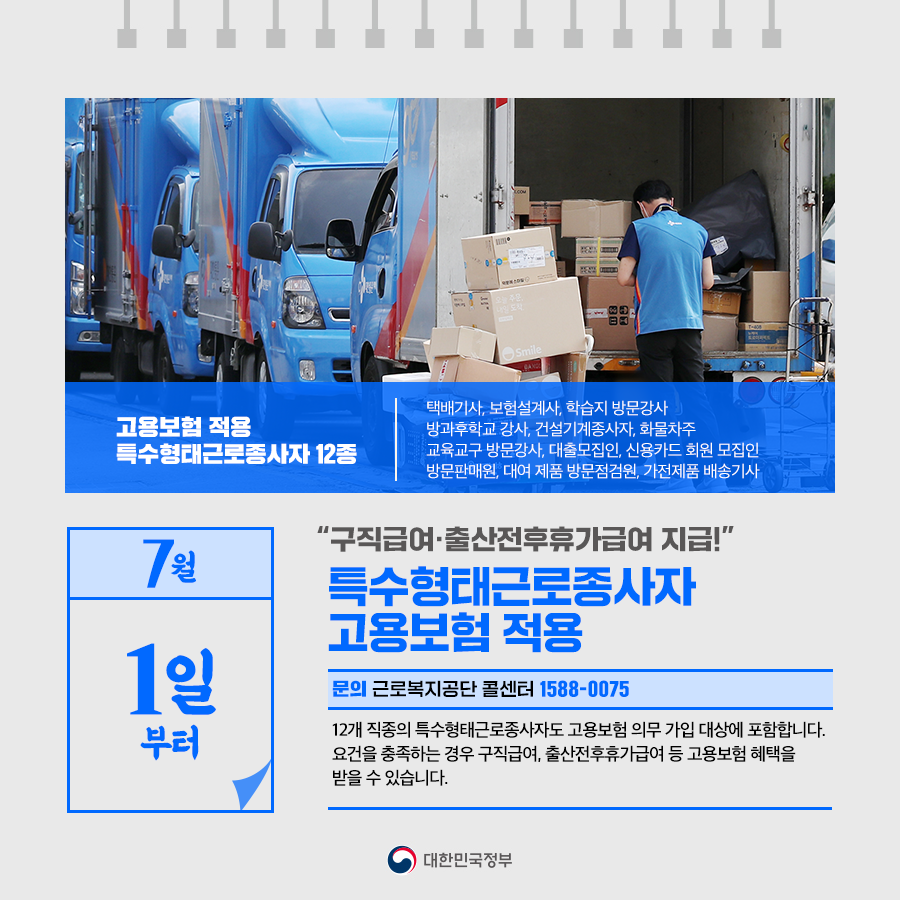 ◆ “구직급여·출산전후급여 지급!”… 특수형태근로종사자 고용보험 적용 (7월 1일부터)