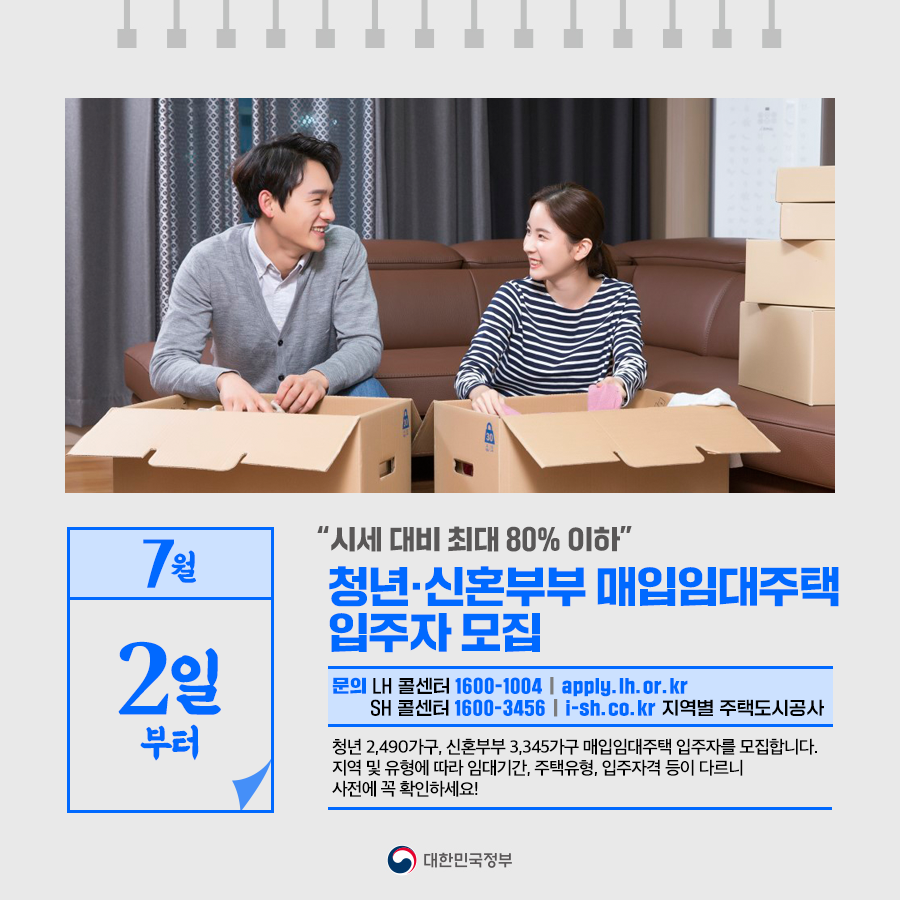 8월 말부터 입주가 가능한 매입임대주택 5,844가구의 청년과 신혼부부 입주자를 모집합니다(청년 2,490가구, 신혼부부 3,354가구). 각 지역 및 유형별로 소득기준, 지원단가, 주택유형, 임대료, 임대기간, 입주자격 등이 다르니 사전에 꼭 확인하세요!