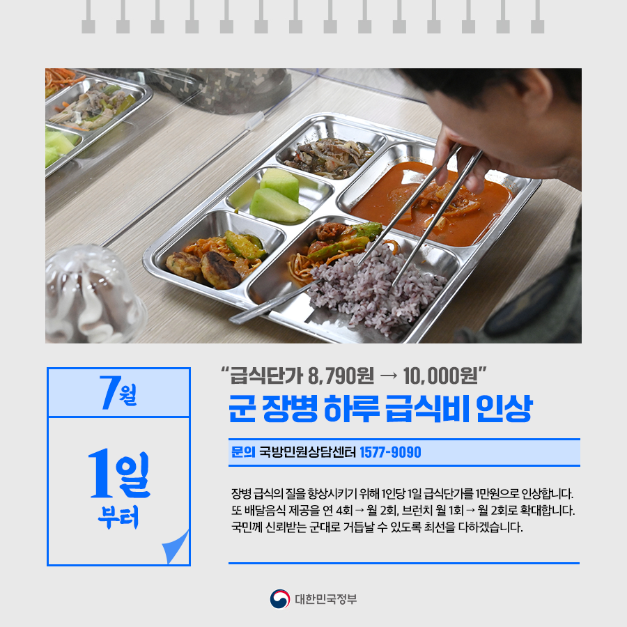 ◆ “급식단가 8,790원 → 10,000원”… 군 장병 하루 급식비 인상 (7월 1일부터)
