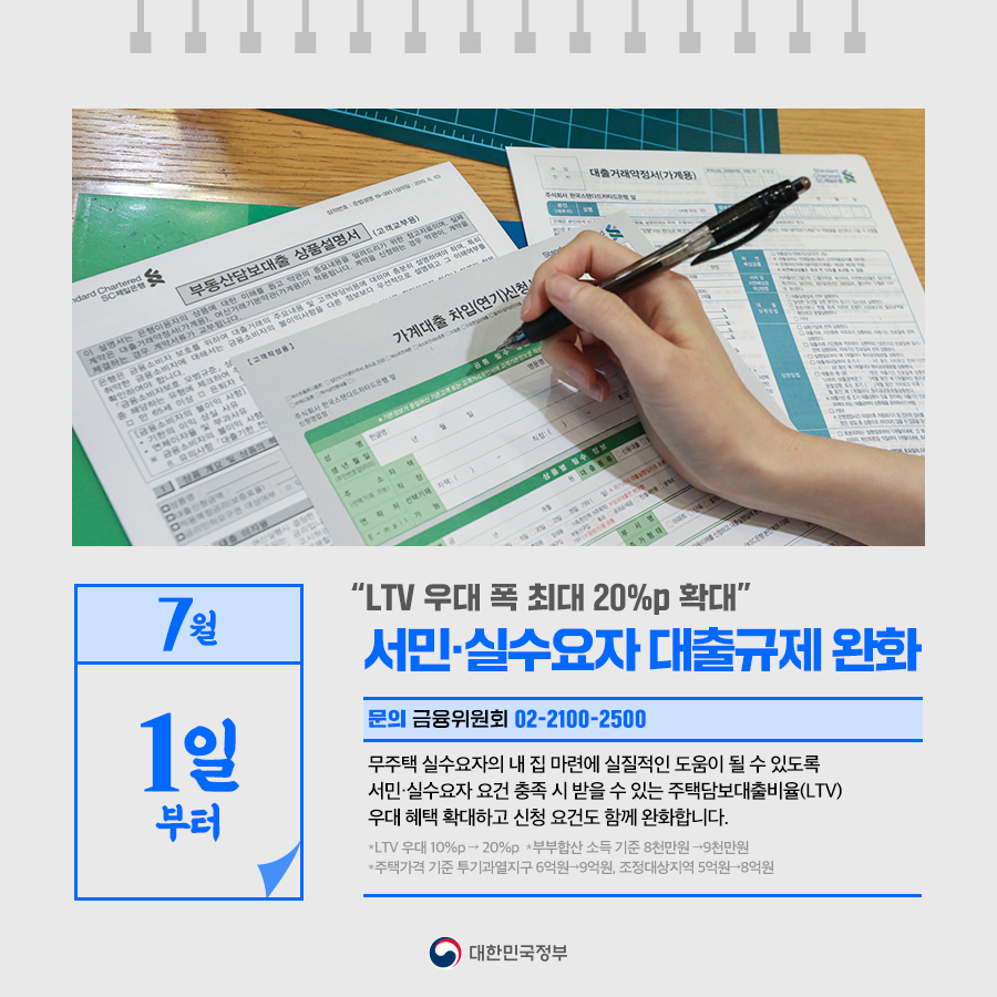 ◆ “LTV우대 폭 최대 20% 확대”… 서민·실수요자 대출규제 완화 (7월 1일부터)