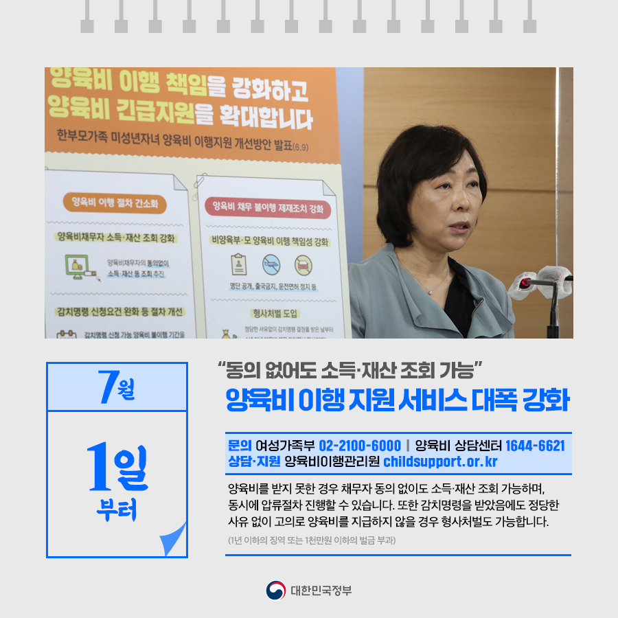 ◆ “동의 없어도 소득·재산 조회 가능”… 양육비 이행 지원 서비스 대폭 강화 (7월 1일부터)