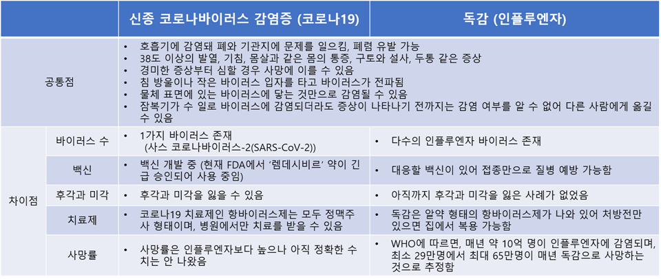 코로나19와 독감(인플루엔자)의 공통점과 차이점에 대해서 알아봤습니다.