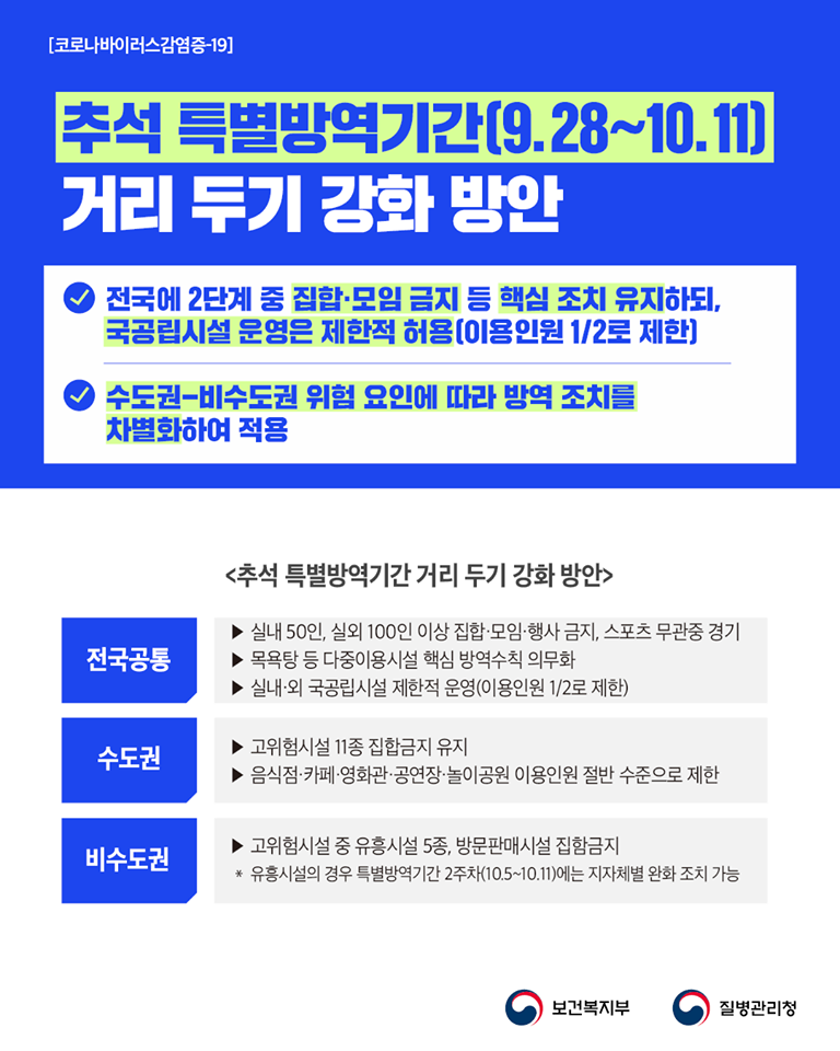 #1 코로나19, 추석 특별방역기간(9.28~10.11) 거리두기 강화 방안