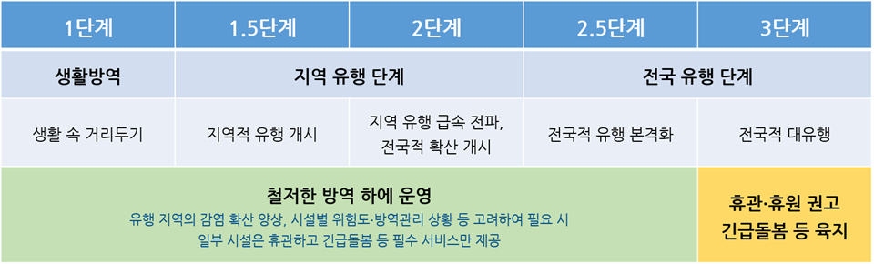 사회적 거리두기 단계별로 자세하게 설명이 되어 있고,