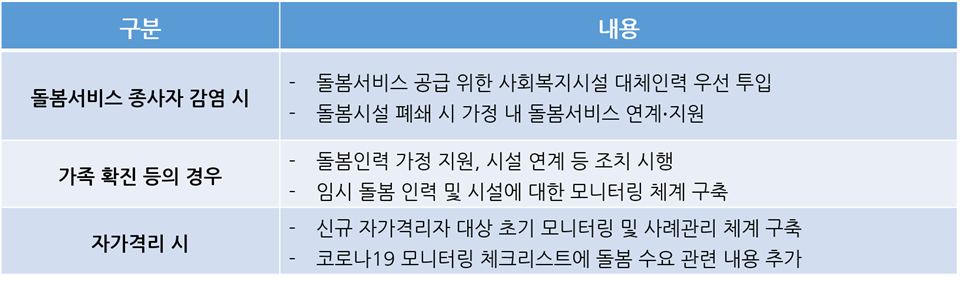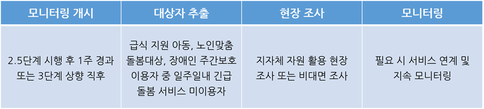 셋째, 돌봄 사각지대 발굴을 위해 선제적으로 대응한다. 사회적 거리 두기 장기화 또는 단계 상향 등의 경우, 아동 및 노인·장애인 등 취약계층을 대상으로 점검(모니터링)을 실시하여, 돌봄 필요 대상자를 발굴하고 필요시 서비스를 연계·지원한다.