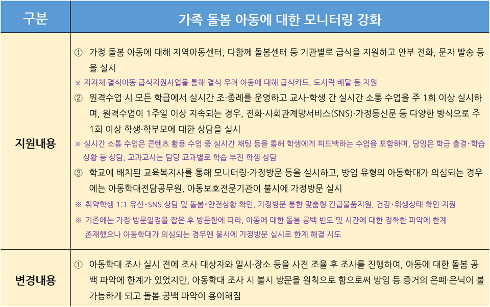 둘째, 가정 돌봄 아동에 대하여 모니터링을 강화한다. 가정 돌봄 아동에 대해 지역아동센터, 다함께돌봄센터 등 기관별로 급식을 지원하고 안부 전화, 문자 발송 등을 실시한다.