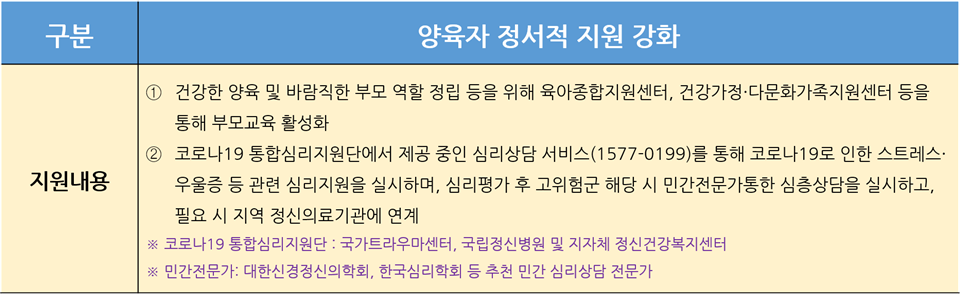 셋째, 양육자의 정서적 지원을 강화한다. 건강한 양육 및 바람직한 부모 역할 정립 등을 위해 육아종합지원센터, 건강가정·다문화가족지원센터 등을 통해 부모교육을 활성화한다.