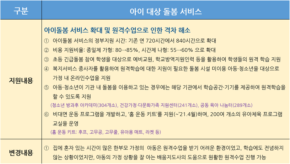첫째, 아이돌봄 서비스를 확대하고, 원격수업으로 인한 격차를 해소한다. 아이돌봄 서비스의 정부지원 시간을 기존 연 720시간에서 840시간으로 확대하고, 비용 지원비율도 확대 (종일제 가형: 80→85%, 시간제 나형: 55→60%)한다.