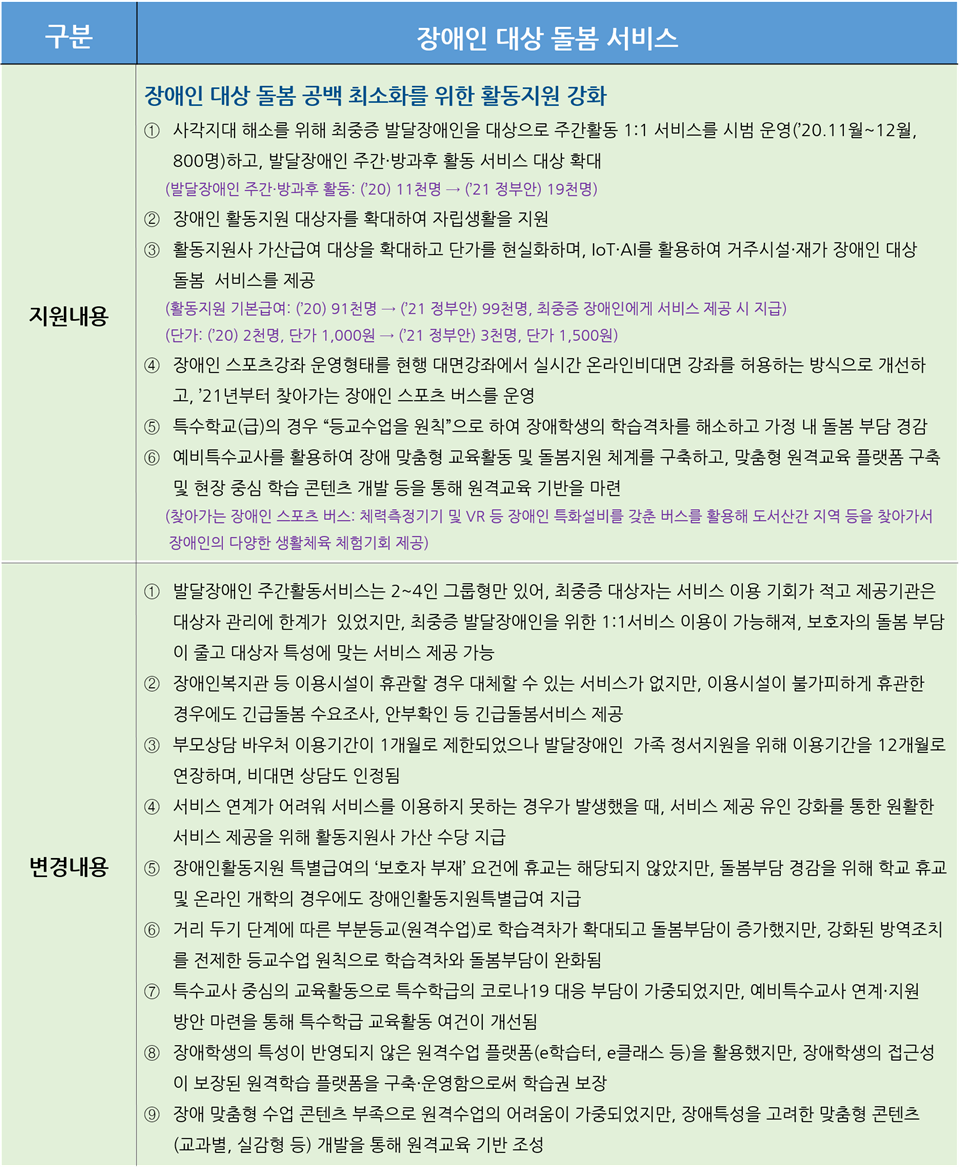 셋째, 장애인을 대상으로 돌봄공백 최소화를 위한 활동지원을 강화한다. 사각지대 해소를 위해 최중증 발달장애인을 대상으로 주간활동 1:1 서비스를 시범 운영(’20.11월~12월, 800명)하고, 발달장애인 주간·방과후활동 서비스 대상을 확대한다.