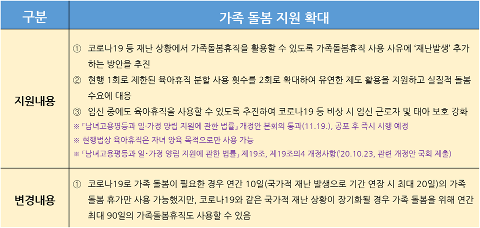 첫째, 가족 돌봄 지원을 확대한다. 코로나19 등 재난 상황에서 가족돌봄휴직을 활용할 수 있도록 가족돌봄휴직 사용 사유에 ‘재난 발생’을 추가하는 방안을 추진한다.