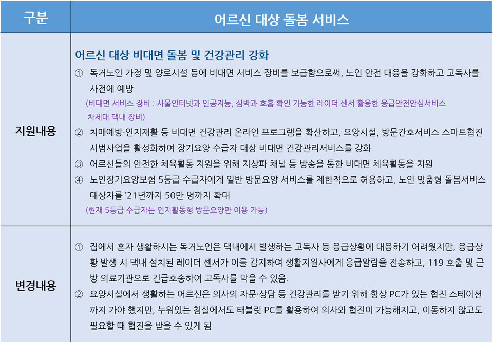 둘째, 어르신을 대상으로 비대면 돌봄과 건강관리를 강화한다. 독거노인 가정 및 양로시설 등에 비대면 서비스 장비를 보급함으로써, 노인 안전 대응을 강화하고 고독사를 사전에 예방한다.