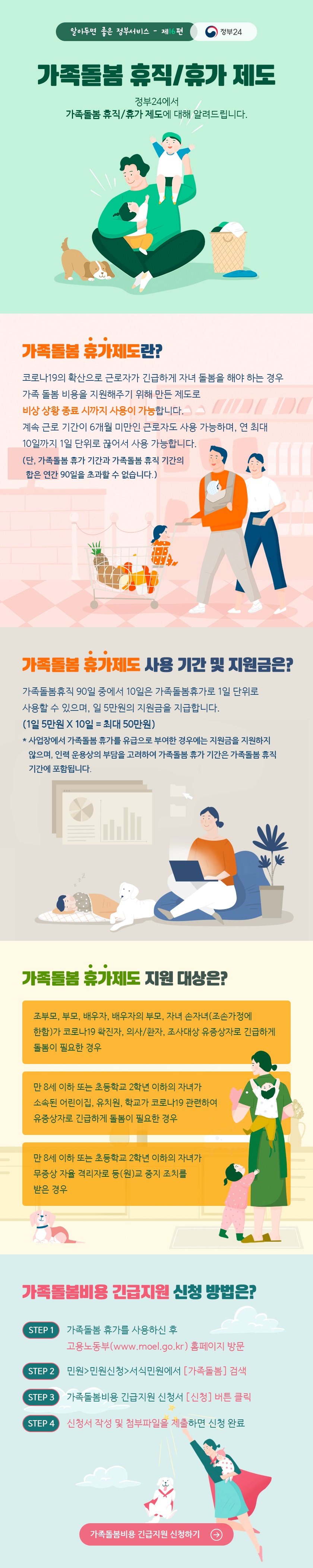 - 가족돌봄휴직 90일 중에서 10일은 가족돌봄휴가로 1일 단위로 사용할 수 있으며, 일 5만 원의 지원금을 지급합니다.