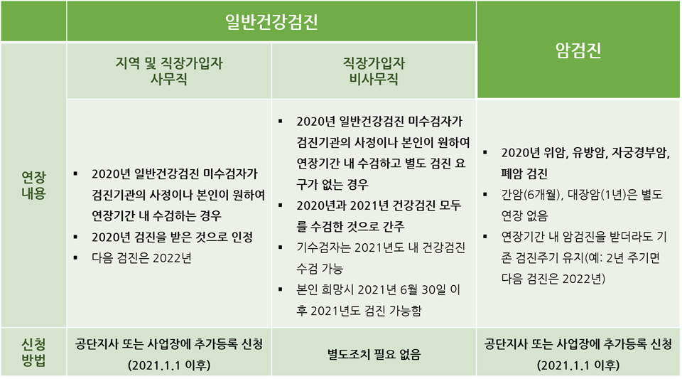 - 기간연장은 2021년 6월 30일(수)까지이며, 단 검진주기가 짧은 간암(6개월), 대장암(1년)의 경우는 가급적 연도 내에 검진 실시를 권장합니다.